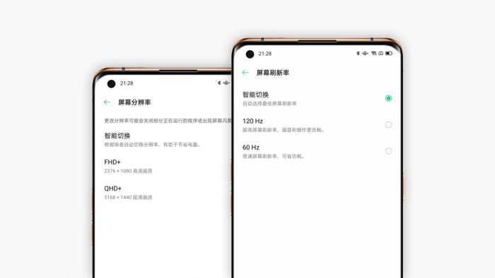 考虑到高分辨率和高刷新率对于手机续航带来的挑战,OPPO Find X2 Pro也在系统设置中开放了分辨率和刷新率的选项,默认为智能状态,根据实时显示的画面内容自行切换,当然也可以根据实际需求手动对两者分别进行自定义。