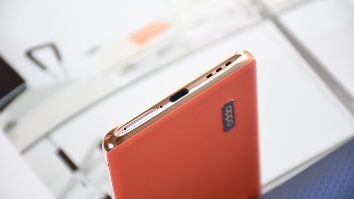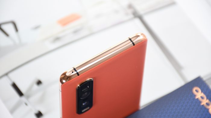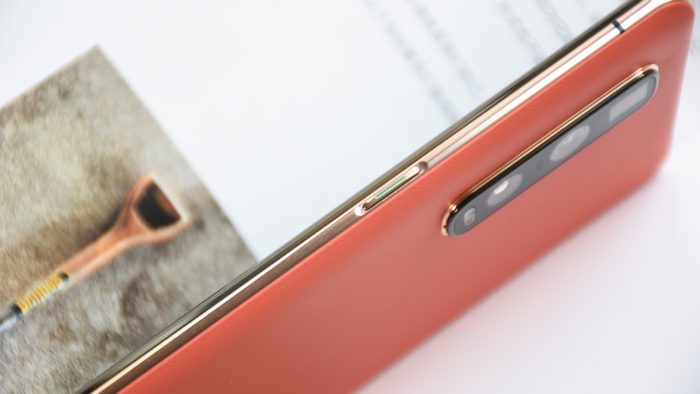 OPPO Find X2 Pro有缎黑、茶橘、雅灰三种配色,分别搭配有不同材质的后盖。我收到的这台是茶橘色,后盖采用接近橙黄色的皮革材质,搭配浅金色金属中框。对设计比较了解的同学相想必都非常清楚,金色是比较难搭配的一种颜色,OPPO Find X2 Pro采用这两种颜色的搭配,姑且不考虑它的出发点,单就实际成品效果而言是非常理想的,属于一种比较中性的配色方案。