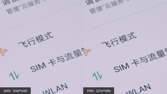 1080P和3K分辨率在日常大多数应用中的感知并不强烈,这其中UI的APP的适配也是一个重要的问题。在显示文字的时候分辨率的差别会相对明显一些,通过上图对比可以看到左边开启QHD+分辨率后的文字边缘的锯齿明显少很多,斜边过度更加平滑自然。