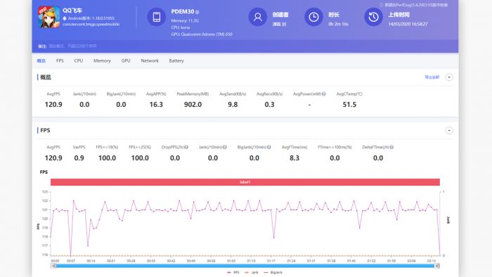 QQ飞车与OPPO Find X2系列合作率先支持120Hz刷新率,想要体验高刷新率需要在手机设置中将智能刷新率选项手动切换至120Hz,否则系统是不会自动切换的。实际测试下来可以保持在平均120.9FPS的状态下满帧运行,也没有出现明显的掉帧现象。高刷新率对于赛车类游戏的感知非常明显,特别是赛道和两旁的草丛等高速向后运动的画面更加连贯,整个游戏体验更加流畅。