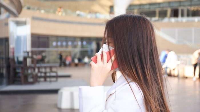 在不开启人像美颜和HDR的状态下前置样张如左图,带了口罩后人脸部分曝光比较暗,背景天空和左侧楼体部分有明显的过曝现象。手动打开前置HDR之后,脸部曝光没有显著改善,不过后方背景高光部分得以压制。