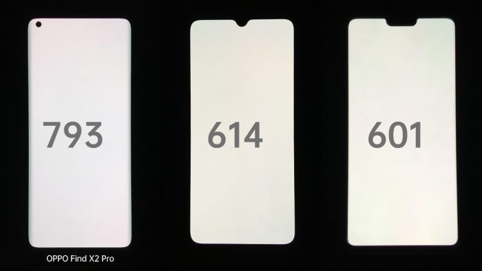 OPPO Find X2 Pro屏幕的全局最高亮度为800nit,将参与对比的手机全部显示为一张白色图片并手动调节至最高亮度,使用照度计测结果如上图,OPPO Find X2 Pro的屏幕亮度最高。在户外光线特别强烈的情况下还会将屏幕的亮度做进一步的提高,实测在光线较强的环境下OPPO Find X2 Pro的屏幕亮度表现也比较出色。
