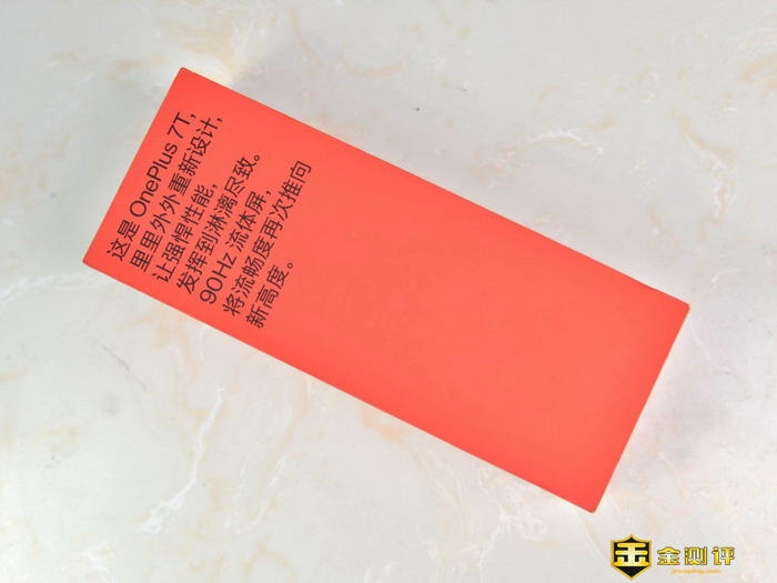 一加手机7T的外包装盒超长,而且设计也是极为的简约,正面仅有关于一加手机7T的部分特点的描述,包装盒的背面贴有标签,上面有手机相关的部分规格参数信息和厂家的相关信息。