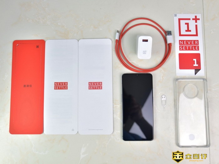 一加手机7T的全家福包含:一加手机7T,硅胶保护壳,电源适配器,Type-C数据线,贴纸,取卡针,说明书等纸质文件。