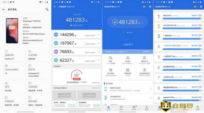 在“设置”里的“关于手机”可以看到一加手机7T的主要硬件参数,高通骁龙855+,8G RAM+256G ROM,48+16+12 MP三摄像头,6.55英寸90Hz AMOLED显示屏。我跑了安兔兔评测,得分是481283,在安兔兔里排行第4。当然,这个成绩仅供参考。安兔兔AI评测的跑分是123717