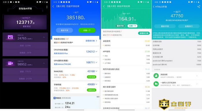 鲁大师性能跑分是385180,体验评测室164.91分, HTML5评测是47750.
