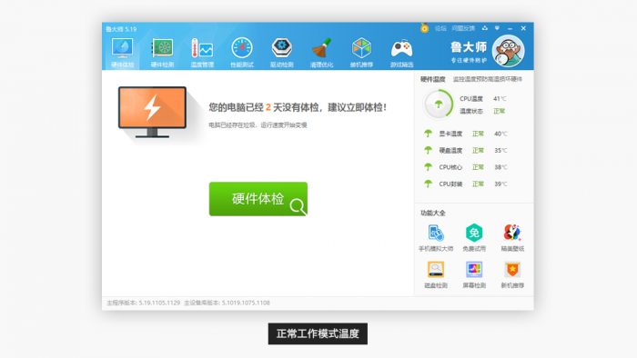在日常办公或浏览网页等场景下,笔记本的发热量还是比较小的,使用鲁大师内置的温度测试得知CPU温度基本保持在41度左右,显卡在40度左右,整体的温控还是非常理想的状态。