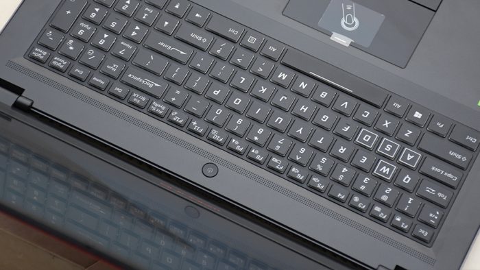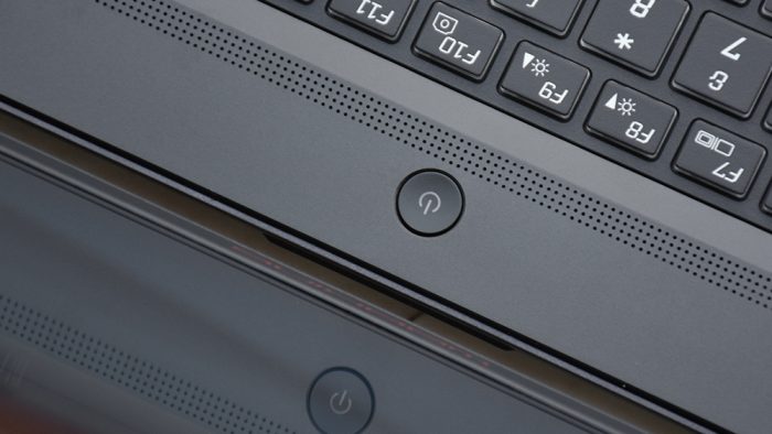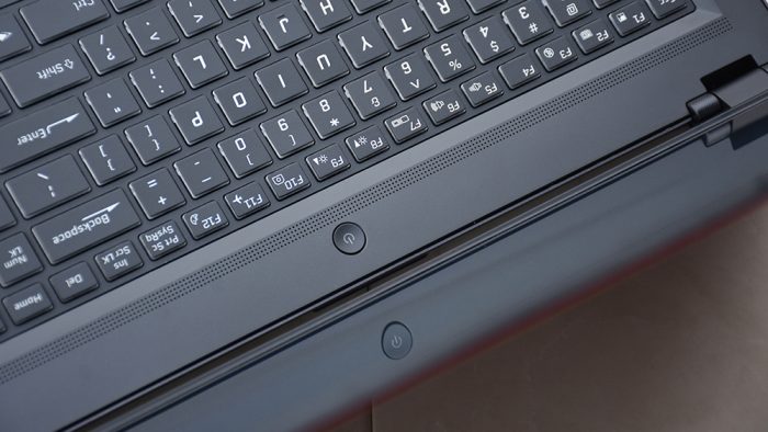 在键盘上方有一排规整的网眼格栅,这就是S17r的喇叭格栅,之所以将扬声器设计在B面键盘上方,我想也是便于声音能够更好的传递出来,对于增大音量、改善音质表现应该是有着积极作用的。喇叭格栅正中间靠上一些的位置是电源按键,圆形独立设计,毕竟游戏本还是要照顾到按键误触的。