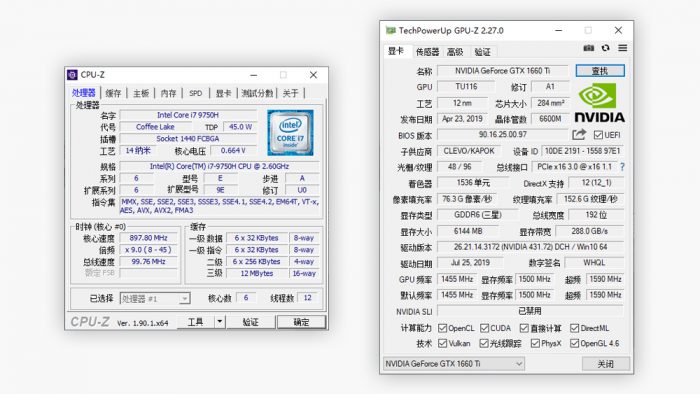 通过CPU-Z软件分析的数据得知,这颗Intel 9750H处理器采用了最新的Coffee Lake架构,是一颗14纳米工艺的六核十二线程的处理器,主频为2.6Ghz。在显卡方面,Nvdia GTX 1660Ti采用的是12纳米制程工艺,显存为6GB,并且搭载了图灵架构,支持DirectX12、OpenGL和CUDA等计算能力。