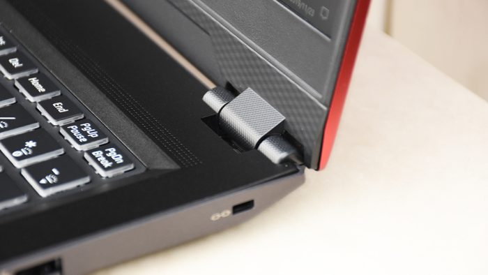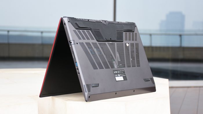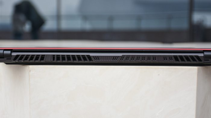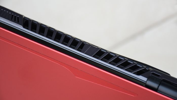 在机身的后方也预留有充分的散热格栅,在两个转轴部分的中间位置几乎被散热孔覆盖,也进一步说明了游戏本或者说是高性能笔记本对于散热的刚需。关于温度方面的表现会在后面的体验环节进行详细测试。