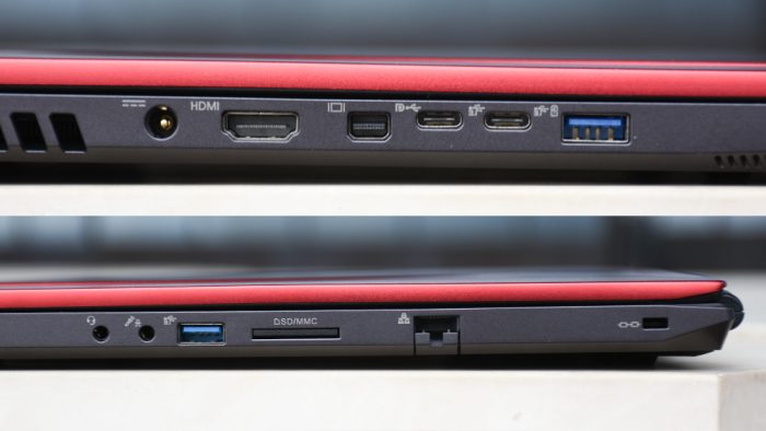 机身左右两侧也被散热格栅和各式各样的接口所占据,左侧靠后是CPU出风格栅,接口部分依次为DC电源接口、HDMI接口、MiNi HDMI接口、两个Type C接口和一个USB 3.0接口。右侧依次为安全锁、RJ-45网线接口、SD卡槽、USB 3.0接口、麦克风接口和耳机接口。从接口设计来看S17r的覆盖算是比较全面的,尤其是加入了比较主流的Type C接口,SD卡槽也方便于像我这样的相机党拷贝照片使用。