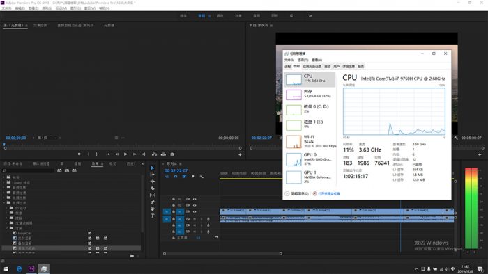 16GB的大内存使得S17r在运行Premiere CC2018以后内存的占用率并不高,进入编辑状态添加4K级别的视频素材并且叠加各种基本的转场特效都比较流畅,在视频编辑过程中 也没有明显的卡顿现象。