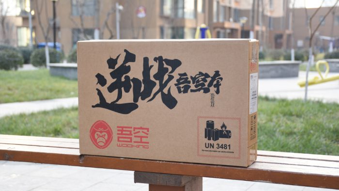 吾空笔记本的包装箱分为两层,外层是牛皮纸的物流包装箱,箱体印刷的信息也比较简单,正反两侧为对称式的设计,印有书法字体的“逆战悟空本”字样,左下角为吾空品牌的标识,右侧则印有UN3481标识,表示产品中包含电池。