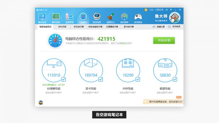 性能部分的直观表现还是通过鲁大师来进行一次跑分测试,实际的跑分成绩如上图,综合成绩为421915分,其中处理器为115910分,显卡为189704分,内存为10290分,硬盘为58830分。