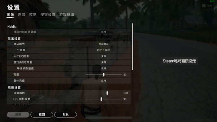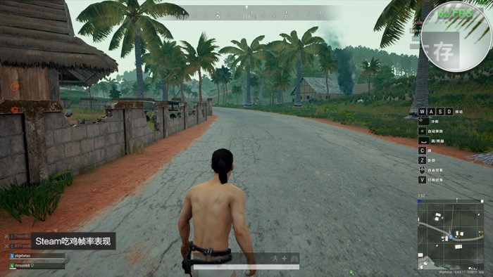 在Steam吃鸡中,系统根据配置情况自动将游戏画面匹配至图上图所示的状态,基本上整体参数度属于超高状态,部分在高状态,鲜明度、垂直同步和运动模糊三项为禁用状态。在此模式下整场游戏基本保持在62帧左右,极少会出现波动的现象,游戏画面的渲染效果也很出色,并且能保持流畅的体验。