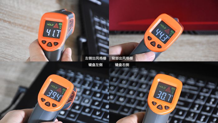 到了大型游戏环节,对着硬件本身功耗的提升,温度也在不断飙升。在玩Steam吃鸡游戏半小时后,鲁大师显示CPU温度为66度,显卡温度为50度。使用红外线温枪测试左侧的出风口温度为41.7度,后方的出风口温度为44.3度,键盘左侧温度为39.4度,右侧为30.7度。人体感知键盘的温度也没有太过明显的发热,由此也基本反映出S17r的风道设计还是比较合理的。