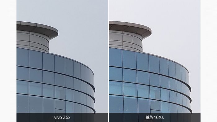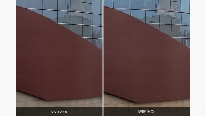 放大建筑物远景细节来看,vivo Z5x 1600万像素的解析力相比魅蓝16Xs 4800万像素的解析力要差一些,不过高解析力带来的问题也体现的很明显,产生了更多的噪点,画面纯净度有所下降。
