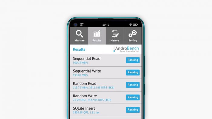 存储芯片的读写速度也是一个影响手机性能的重要因素,尤其是一些影像创作者需要经常拷贝视频或图片素材。在这个环节使用AndroBench进行读写速度测试,通过上面的测试截图可以看到,vivo Z5x的连续读取速度为500.19MB/s,连续写入速度为193.02MB/s,整体表现符合主流UFS 2.1芯片的性能发挥。