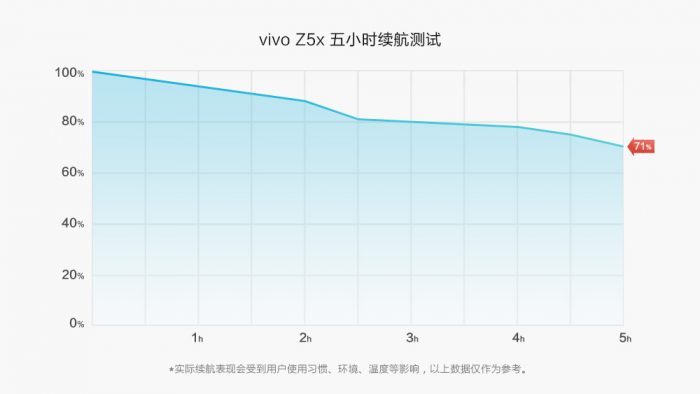 在体验过程中我专门对vivo Z5x进行了五小时续航测试,稍有不同的是在测评的环节和项目上有所改变,毕竟很多的测试场景在生活中并不好找到。实测结果数据如下:佩戴耳机音量35%观看在线视频播放两小时耗电12%;拍照录像半小时耗电7%;佩戴耳机音量35%音乐播放1.5小时耗电2%;连续刷微博0.5小时耗电2%;游戏《和平精英》半小时耗电6%,连续5小时测试总耗电29%。