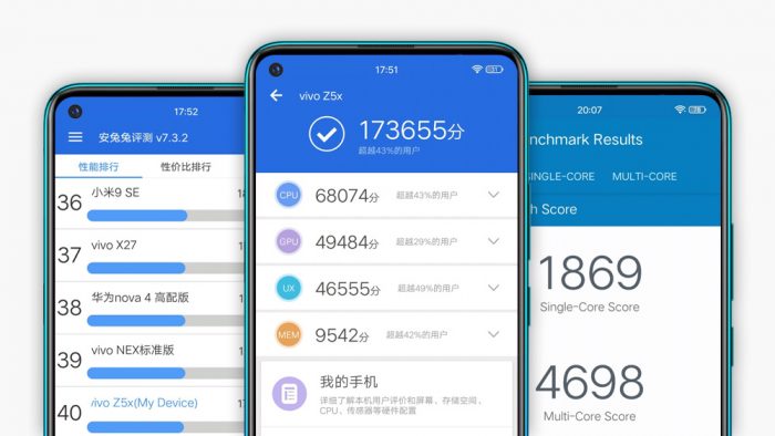 衡量一款手机的性能表现,最直观的还是通过专业的跑分测试软件进行测试,vivo Z5x在安兔兔跑分中获得173665分的成绩,与上一代NEX标准版以及华为P20保持在同一水准。GeekBench4 CPU测试的单核成绩为1869分,多核成绩为4698分。