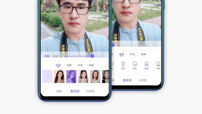 趣美颜包含一些人像方面的美化选项,通过AI智能识别技术识别到画面中的人物本体,支持滤镜、美颜、补妆、美体方面的设置。