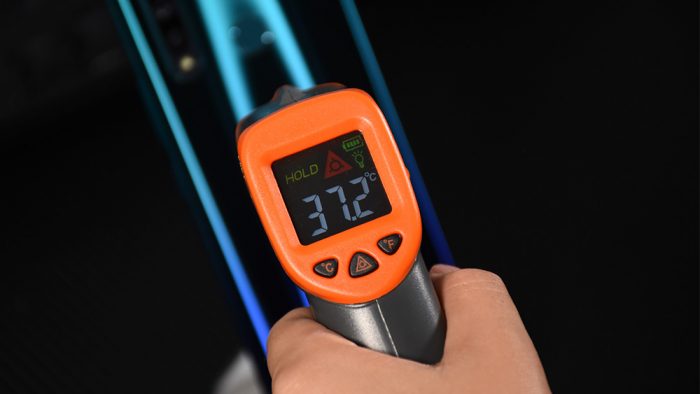 vivo此次也为Z5x设计了Cooling Turbo散热加速技术,对手机整体的温控策略重新进行了优化设计,搭配机身内部的铝合金金属以及石墨烯散热设计,使得Z5x的整体散热表现比较突出。在体验以上两款游戏的过程中,每一局游戏过后(约30~40分钟)使用温枪测试手机温度,vivo Z5x机身发热区域集中在机身背部指纹模块下方的位置,半小时游戏后最高温度为37.2摄氏度。