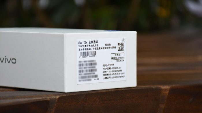 白色的主包装简洁大方,vivo的品牌标识以及Z5x的型号标识均采用烫蓝金工艺印刷,在光线下能够看到细微的质感变化,细节处理可见用心,一款产品的包装设计也足以看出厂商对于这款产品给予的价值和使命。左右两侧印有灰色的vivo品牌标识,与正面相比稍显低调,也是避免抢了风头吧。