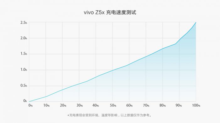 在充电方面,vivo Z5x的标配充电器支持5V-2A和9V-2A两种输出规格,最大输出功率为18W。在体验过程中我也对vivo Z5x的充电速度做了一次完整测试,充电效率图表如下图。实测半小时可以充至26%,一小时充至50%,完整充满大约需要2.5小时左右。考虑到电池容量比较大,这样的充电速度也在可接受的范围。