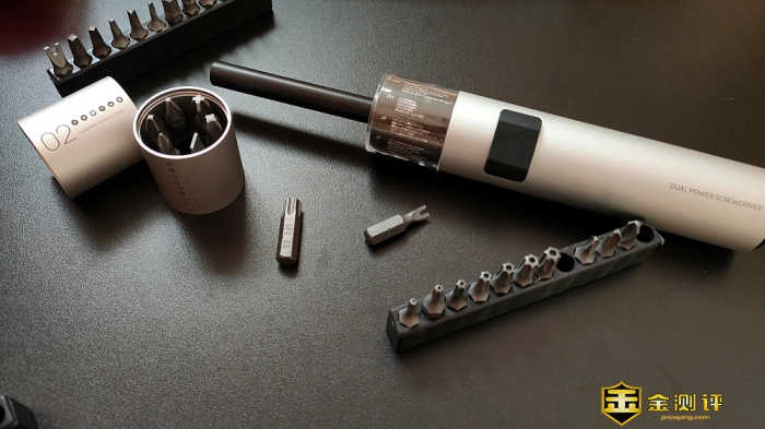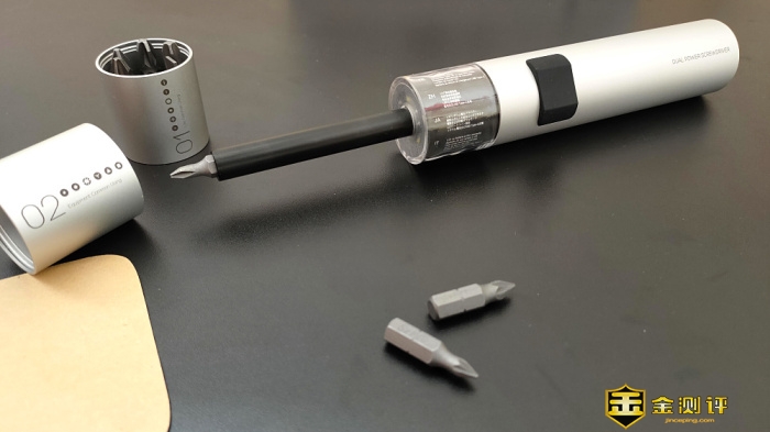 机身外壳是银色磨砂铝合金材质,做工精致,有着一种浓浓的苹果风,前端两个可拆卸的收纳装置可收纳多颗螺丝刀批头,便于收纳最大限度的还原工具的简约本色,手柄直径31mm,长度210mm,小巧便携握感舒服,能够满足很多场景的使用,可以说是一款既好看又能打的电动螺丝刀。