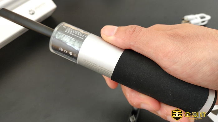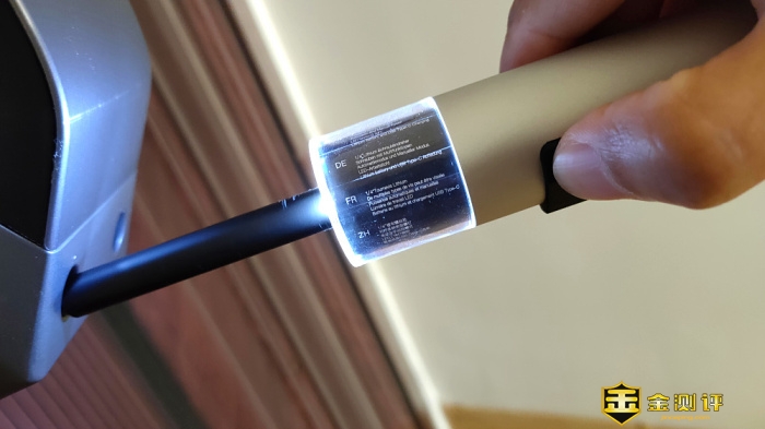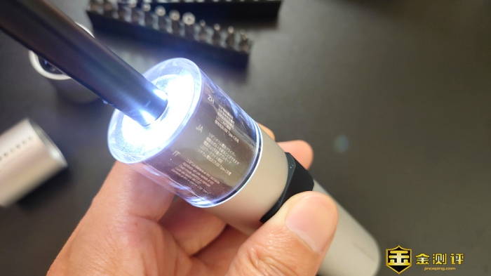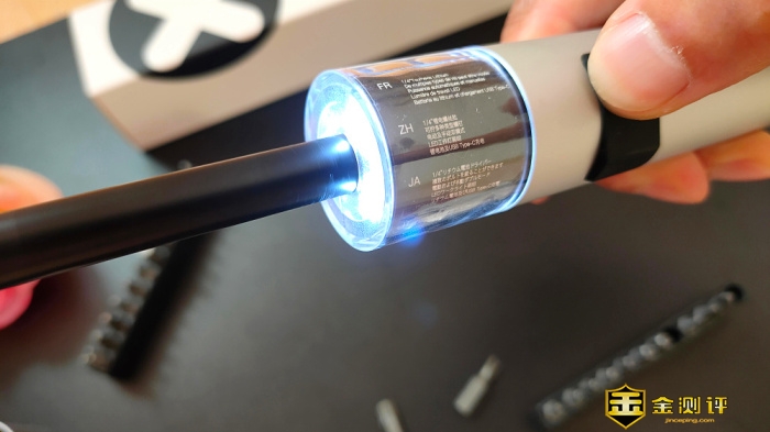 细节方面做得也不错,螺丝刀内置了3颗LED无影灯,使工作区域照明无死角,但小灯没有单独的照明开关,只要螺丝刀工作时,灯光便会跟着同步点亮;灯光部分的圆柱体是透明塑料材质,内部处装LED照明灯以外还内置了一张多国语言功能宣传贴纸,但这宣传设计的位置总感觉到有点怪怪的,或许厂家想要一种科幻的灯光贴纸秀,材质虽很结实但还是会营造一种不结实的错觉。