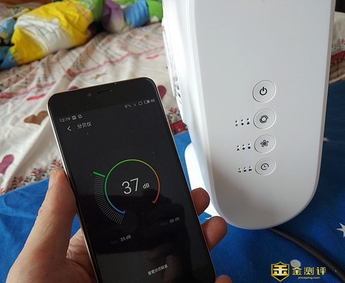 开机前,测得室内噪音指数为37dB。开机后,选择暖风模式,再选择低档加热模式,测得噪音指数为61dB,比官方介绍最高噪音40dB高一点。