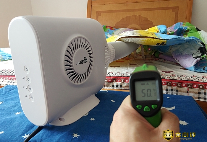 开机(暖风模式)大约20分钟左右,离暖风机远的被窝已测得39度左右了,快速暖被效果不错啊。再过10分钟后,被窝内的温度达到50度以上,足可以杀菌除螨。