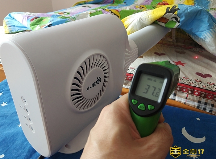开机(自动跳到烘暖模式)大约5分钟后,测得靠近暖风机被窝的温度已上升到37度左右了,当然整个被窝还没有暖和起来,离暖风机远的被窝测得还是22度左右。