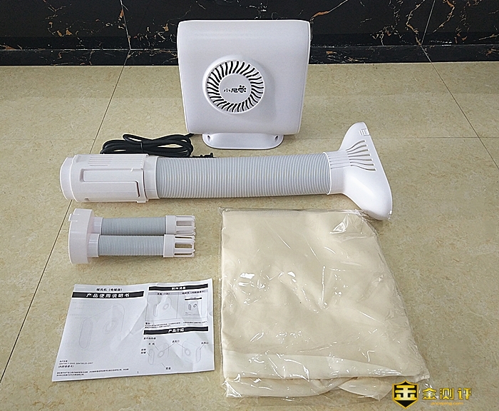 撕开配件包装箱子的封箱透明胶布,也可以轻易地掀开箱子的上盖,取出3D循环出风接口、可伸缩软管外接烘鞋器、超大容量干衣袋。