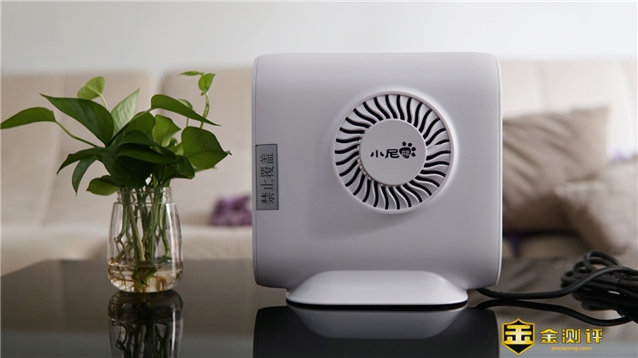 侧面的是出见口,小尼熊品牌刚好设计在其中。这里有醒目的标语:禁止覆盖,提示使用安全的问题。不过另一面是没有这个提示的,因为它支持卧放着使用。整机的尺寸大概是229*234*114mm,重量约为1KG,如此设计,带来更小的空间,即使是较窄小的桌面,摆放起来也方便。