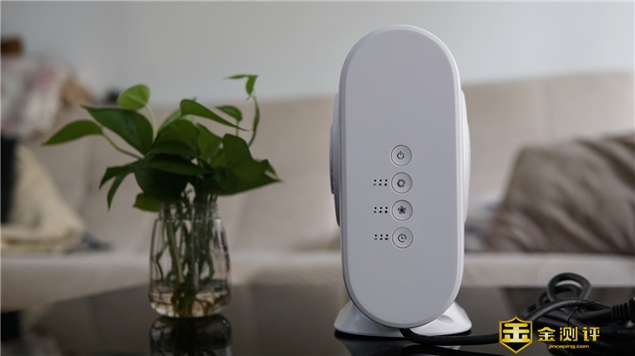 白色的机身能更好地融入到一般的家居环境中,整机设计简洁,给人的感觉走简约风格。如果有多一些更为活泼的颜色选择,相信会更好。机身背面一共有四个按键,最上面的就是开关机键;第二个是模式选择键;第三个是温度档位键;最下面的是定时选择键。除了开关机键,其它三键旁边都有LED指示灯。