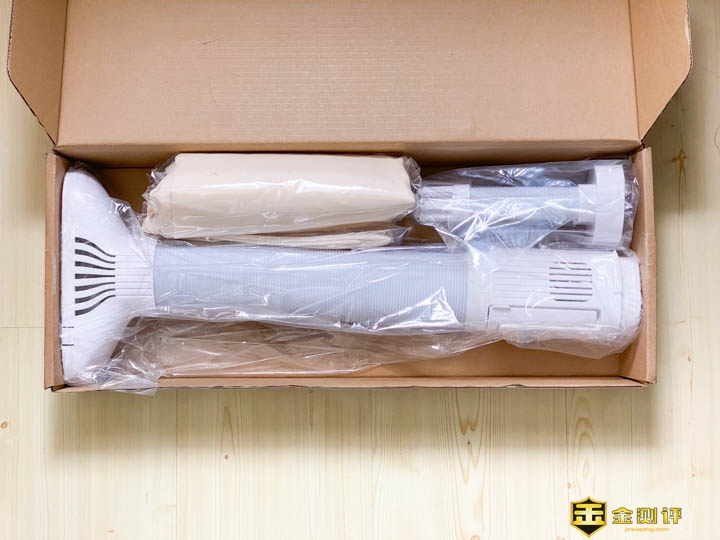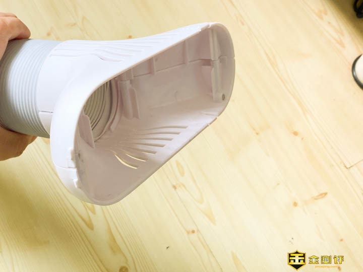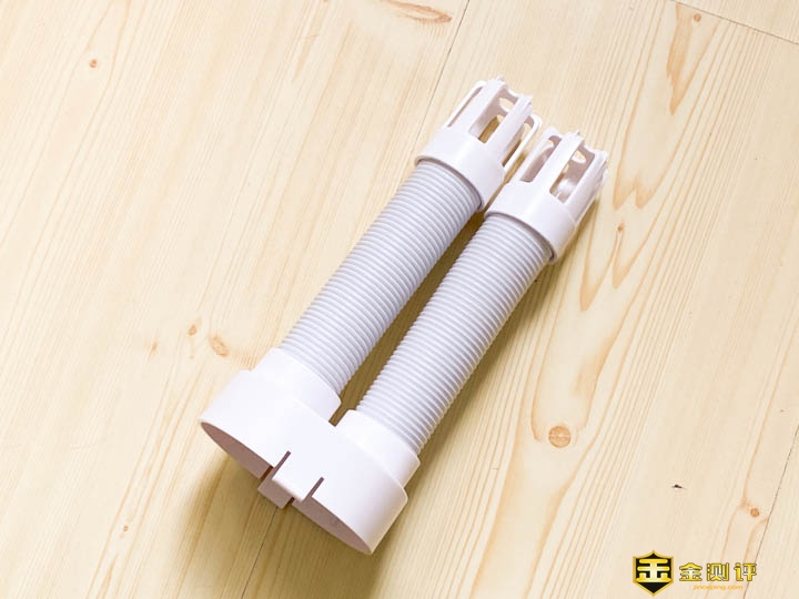 我们来看看配件,首先是一个看上去白色的烟筒通道似的物件。一头是圆形,另外一头是长椭圆形的。