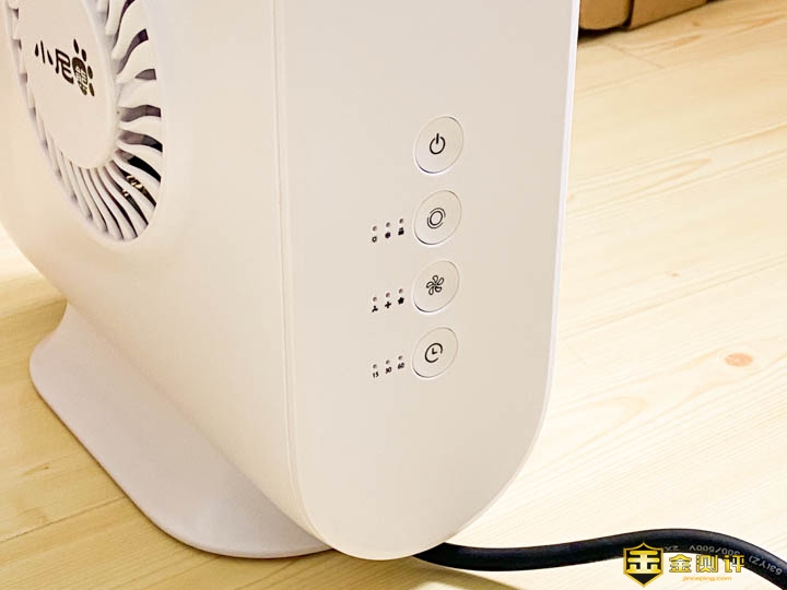 按钮在侧边,有四个按钮。最上面的是电源按键,下面三个按钮边上都有3个指示灯。第二个按键是温度控制,按动可以切换加热功率,分别是500W/1000W/2000W,第三个按钮是风量控制,有大中小三档,最下面的是定时开关,也有三个档位,15分钟、30分钟、60分钟。