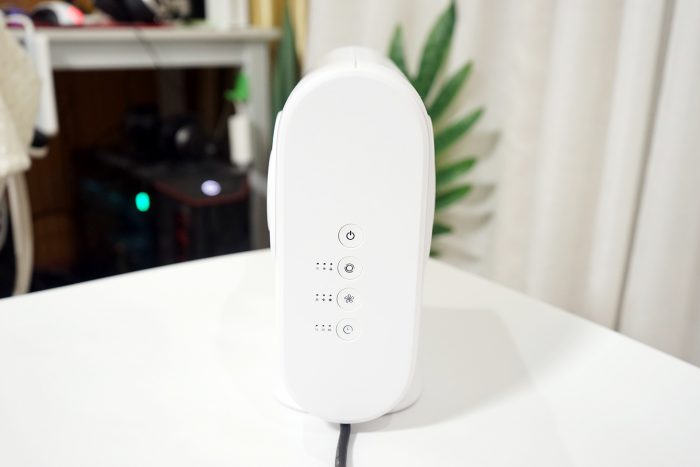 小尼熊多功能暖风机背面设计有四个实体按键,从上至下依次是待机键、模式选择、温度档位、定时选择。暖风机底部有2条软脚垫,作用是能减少对桌面的磨损,放置更平稳!