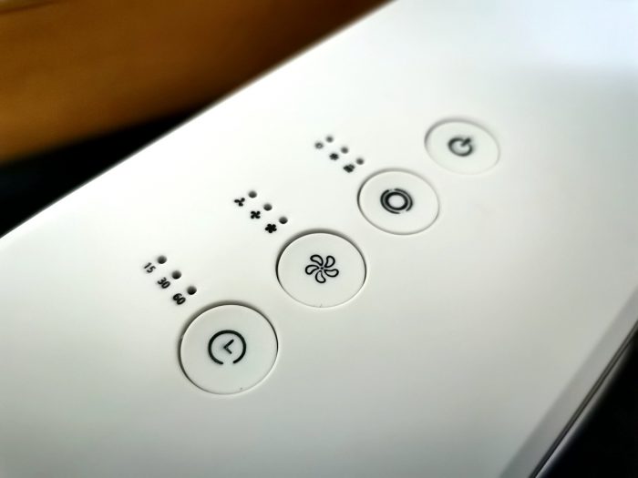 按键位于机身侧面,从上至下依次是待机键、模式切换键、风速调节键和定时键。