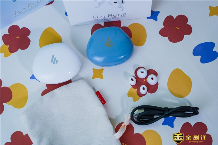 包装盒内包括FunBuds耳机和充电盒、充电线、可替换的耳塞、收纳袋以及说明书、保修卡等纸片若干。