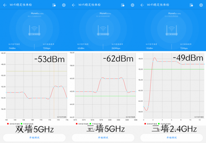 在日常使用的当中,通过它的5GHz Wi-Fi信号,在路由器附近可以获得高达35dBm信号强度,以及400Mbps以上的速率,这样的表现对于玩游戏来说绝对绰绰有余,掉线以及高延迟完全成了闻所未闻的情况。即使隔了一堵墙,5GHz Wi-Fi的信号强度也是在60dBm的范围,速率则是200Mbps左右,依然可以正常使用,而2.4GHz Wi-Fi的表现则是50dBm的信号强度,以及70Mbps以上的速率,即使隔了两堵墙后,2.4GHz Wi-Fi信号依然稳定,60dBm的强度和70Mpbs的速率基本没什么变化。