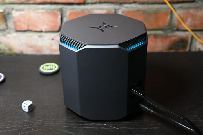 真正拿到手后可以看到,这款路由器本身很轻巧,摸上去手感不错,放在桌面上也不占什么空间,特别是它这种机甲造型的外观设计,很多喜欢玩游戏的朋友,应该都对这种风格很熟悉。并且在加上它顶部这种游戏灯效之后,平时放在家里使用,还会有一定的装饰性。配件方面,它还有专属的电源适配器和网线,线缆长度都不错,不用担心不够用。