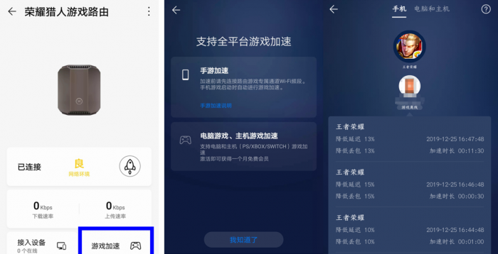 因为现在大家主要玩手游,所以使用荣耀猎人游戏路由的时候,也相当于获得软硬件结合的免费双重加速。实际使用当中,在游戏Wi-Fi下,因为没有了其它设备的干扰,所以在玩游戏的时候不仅信号很强很稳,而且延迟也完全不需要担心。