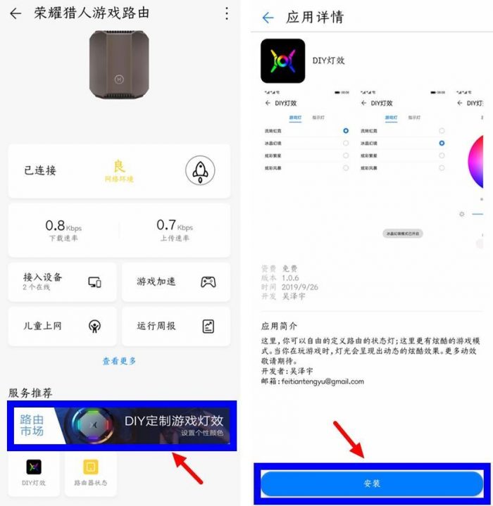前面提到这款路由器本身有一种游戏灯效的呈现,而且这种灯效也是可以调节的,只需要在华为的智慧生活APP里,找到路由器的设置界面,然后进入到下面的路由市场,安装一个叫做“DIY灯效”的插件就可以了。