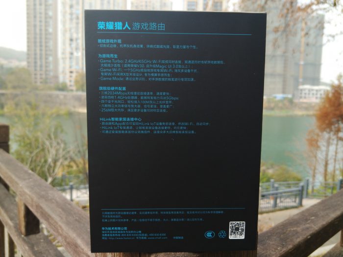 初拿到产品的时候非常不敢相信这款路由器包装这么小,在我的印象中游戏的路由器都应该像某硕那种拥有半人多高的样子,而其真实包装与早期的荣耀Pro路由一般大小。在包装外壳处理方面采用黑色作为主色调,通过模拟反光方式展现路由产品的全貌,并在周边配合附有科技感的电路线条纹理给人感觉非常的赞。