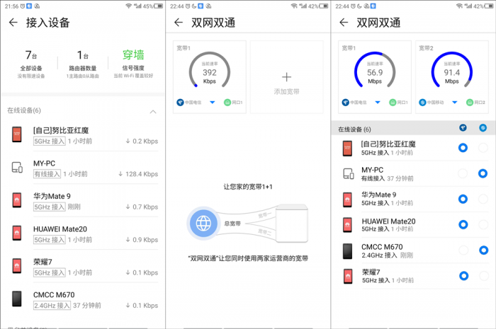 对于双网双通功能普通用户接触的并不多,而早期使用过双网的用户都要经过复杂的路由刷机调试方可实现,反正就是非常麻烦。而荣耀猎人路由针对此类用户提供了简单便捷的接入双宽带的功能,用户仅需将两条网线插入任意端口,在APP端即会呈现出接入网线所在端口,并且在双网双通界面也会产生变化,用户可以根据自身使用需求自由的调节接入设备网络往来于哪条宽带,实现物理层面引流上网,避免带宽拥堵。