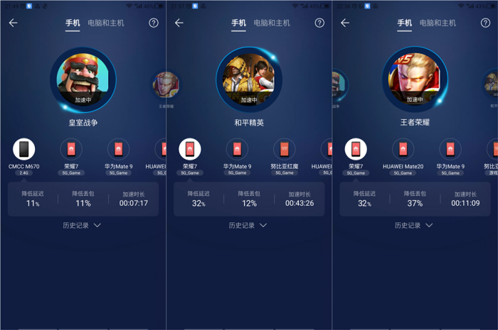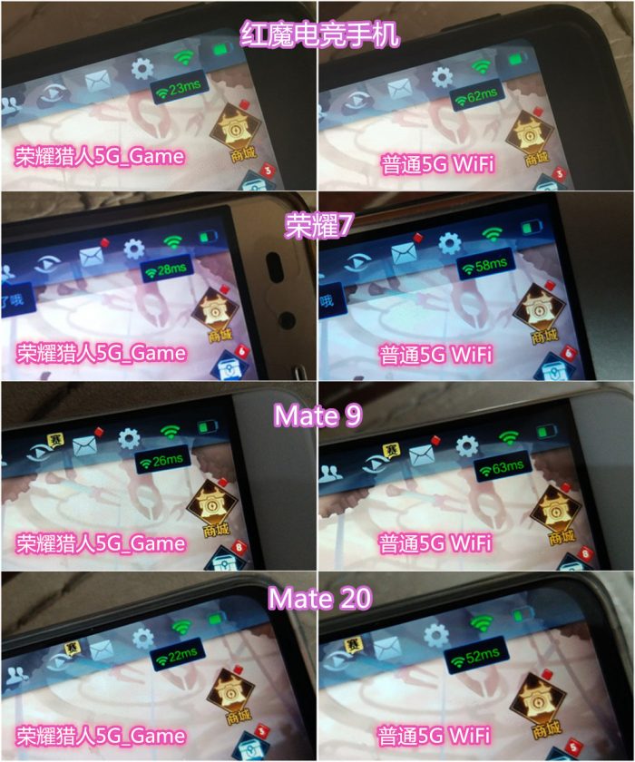 当然,如果你没有两条宽带也不用捉急,在带宽充裕的情况下就是游戏加速模式起作用的时刻了。对于家中复杂的WiFi设备接入情况下进行游戏体验时,荣耀猎人的游戏加速功能就能够正确的分离出游戏数据包并为用户提供最佳的数据通道。这里笔者选择了三款自己常玩的游戏作为对比测试,由于移动定制机不具备5GWiFi功能,所以仅它为2.4G其余设备则通过5G_Game通道。