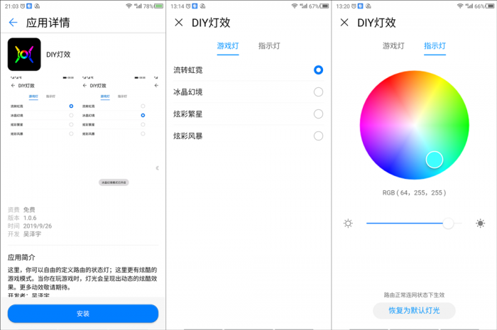 作为一款附带灯光效果的酷炫路由器,自然会想要让它在朋友面前炫耀展示一番。所以笔者安装了DIY灯效这项API控件。从应用界面布局来看,其界面可划分为预设游戏灯、自定义指示灯两个区域。