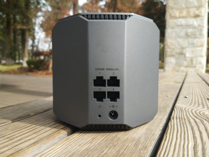 在机身的背部非常规整的排布着具备自适应功能四枚盲插全千兆网口,复位按键、DC电源口也整齐的排列在最低一排。由于这款路由器采用三频2100Mbps设计,所以在路由器为每路WiFi通路都提供了2个大功率的放大器,此外还具备支持双网双通网络交互能力,并配以双频优选以及专属游戏WiFi为用户提供丰富的通道选择,足以应付绝大多数游戏玩家家庭无线网络需求。